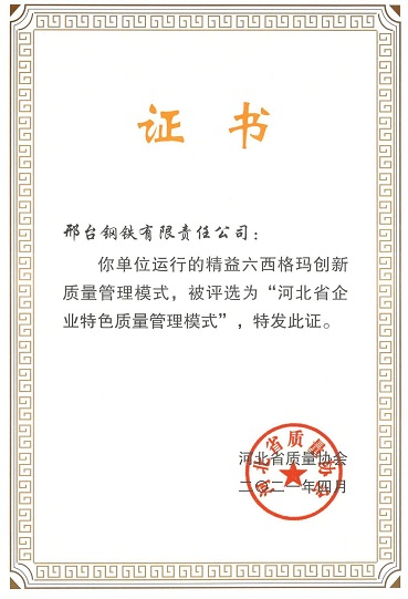 - Recently, the list of the first batch of " Characteristic Quality Management Model of Hebei Enterprise " selected by the Hebei Quality Association was announced. Xingtai Iron and Steel Cor., Ltd. (hereinafter referred to as Xingtai Steel), as one of the 10 enterprises received this award, declared…
