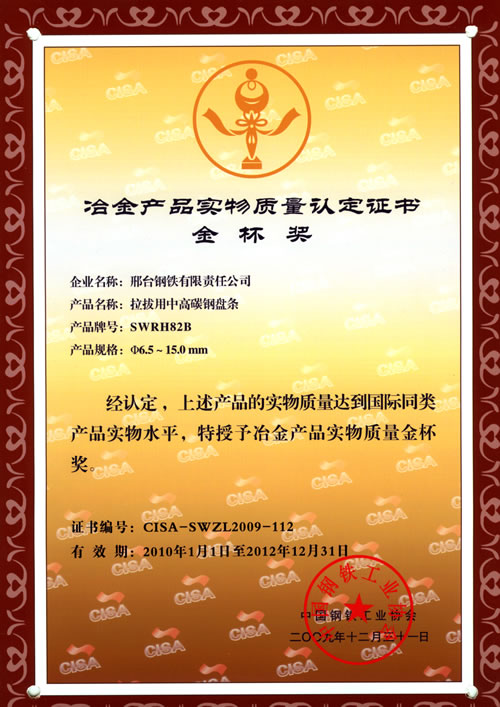 Medium and high carbon Wire SWRH82B for drawing awarded the Gold Cup Prize of Metallurgy products.