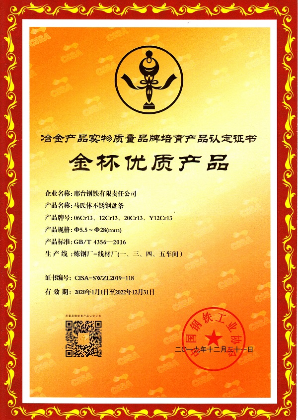 邢鋼鐵素體不銹鋼盤條10Cr17 φ5.5-18mm規(guī)格獲冶金產品實物質量金杯優(yōu)質產品認定證書