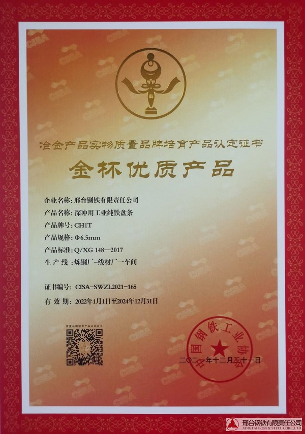 深沖用工業(yè)純鐵盤條CH1Tφ6.5mm規(guī)格獲冶金產品實物質量金杯優(yōu)質產品認定證書