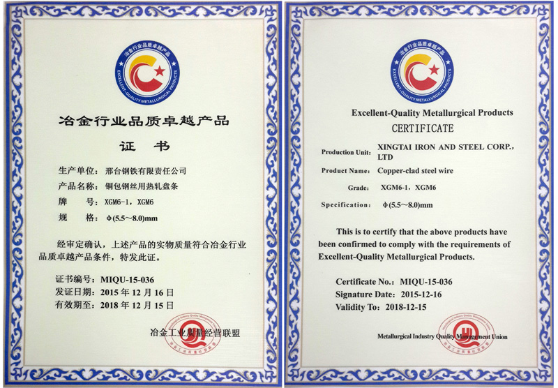 銅包鋼絲用熱軋盤條XGM6-1、XGM6φ(5.5~8.0)mm獲冶金行業(yè)品質(zhì)卓越產(chǎn)品