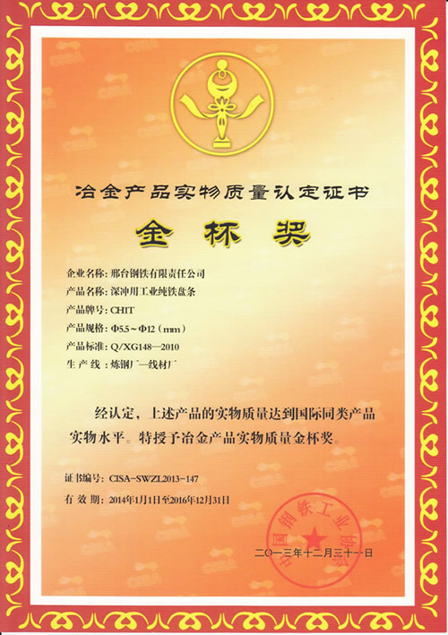 深沖用工業(yè)純鐵盤條CH1Tφ5.5~12mm獲冶金產(chǎn)品實物質(zhì)量金杯獎