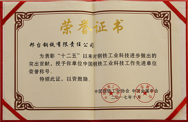 2017年10月,邢鋼被中國鋼鐵工業(yè)協(xié)會和中國金屬學會聯(lián)合授予“十二五”中國鋼鐵工業(yè)科技工作先進單位榮譽稱號。