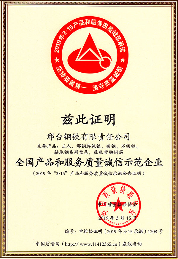 2019年3月15日,邢鋼(主要產(chǎn)品:三人、邢鋼牌純鐵、碳鋼、不銹鋼、軸承鋼系列盤條,熱軋帶肋鋼筋),被中國質(zhì)量檢驗協(xié)會授予“全國產(chǎn)品和服務(wù)質(zhì)量誠信示范企業(yè)”稱號。