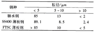 通常認(rèn)為鋼中粒徑在1-50μm的非金屬夾雜物都屬于顯微夾雜物。對(duì)于高品質(zhì)特殊用途鋼種,鋼中粒徑小于10μm的顯微夾雜物占有非常大的比例。表l為國(guó)內(nèi)幾種特殊鋼中顯微夾雜物的粒徑分布。