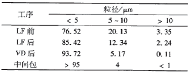 目前,鋼中顯微夾雜物的控制和去除難度較大。在冶煉過程中,鋼水溫度、鋼中成分含量、鋼包吹氬操作、中間包結(jié)構(gòu)以及鑄坯冷卻速率等因素均對(duì)鋼中顯微夾雜物的粒徑分布有明顯影響。表2是采用LF-VD-中間包工藝生產(chǎn)軸承鋼時(shí)各工序鋼中顯微夾雜物的粒徑分布。