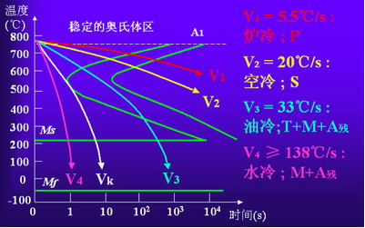 等溫轉(zhuǎn)變“TTT曲線”在連續(xù)冷卻轉(zhuǎn)變中的應(yīng)用:由于連續(xù)冷卻“CCT轉(zhuǎn)變曲線”的測定較為困難,而連續(xù)冷卻轉(zhuǎn)變可以看作由許多溫度相差很小的等溫轉(zhuǎn)變過程所組成的,所以連續(xù)冷卻轉(zhuǎn)變得到的組織可認(rèn)為是不同溫度下等溫轉(zhuǎn)變產(chǎn)物的混合物。故生產(chǎn)中常用TTT曲線(C曲線)近似地分析連續(xù)冷卻過程。下圖中V1(爐冷)、V2(空冷)、V3(油冷)、V4(水冷)代表熱處理中四種常用的連續(xù)冷卻方式。