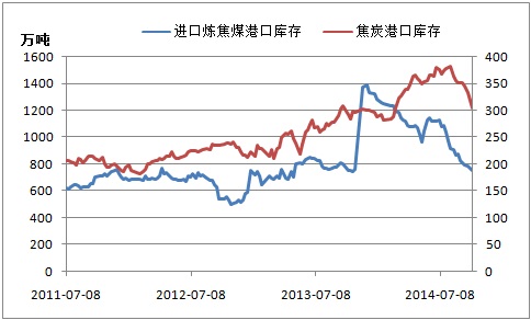 據(jù)我的鋼鐵網(wǎng)監(jiān)測,截至10月10日日照港、連云港、天津港焦炭庫存合計303.7萬噸,自8月8日達到380.6萬噸的年內(nèi)最高位之后,港口庫存處于持續(xù)下滑態(tài)勢。不過,國內(nèi)鋼企焦炭庫存仍保持低位,并無明顯補庫意愿,導(dǎo)致焦炭價格暫穩(wěn)運行,一旦后期鋼價持續(xù)堅挺,或推動鋼企入市采購。