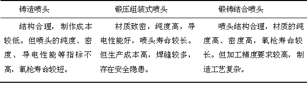 因為拉瓦爾孔型具有比較高的射流速度,所以氧槍噴頭一般都采用拉瓦爾孔型。為了便于制作擴(kuò)張段,均簡化為圓錐形。在最近幾年的不斷進(jìn)化中,甚至還出現(xiàn)了“突擴(kuò)”、“旋轉(zhuǎn)”等特殊孔型。按氧槍噴頭的制造方法,氧槍可分為鑄造噴頭、鍛壓組裝式噴頭及鍛鑄結(jié)合噴頭,三種噴頭特點下表所示。