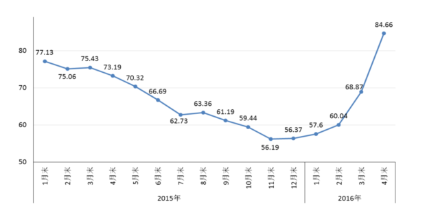 4月末,鋼鐵協(xié)會CSPI中國鋼材價格指數(shù)為84.66點,環(huán)比上升15.79點,升幅為22.93%,較上月加大8.22個百分點,連續(xù)5個月環(huán)比上升;同比上升11.47點,升幅為15.67%。(見下圖)