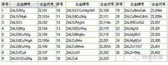 鋁合金按照加工方法的不同分為兩大類,即壓力加工鋁合金和鑄造鋁合金(分別以YL和ZL表示)。在鑄造鋁合金中又依主要加入的合金元素的不同而分為四個系列,即鑄造鋁硅合金、造鋁銅合金、鑄造鋁鎂合金和鑄造鉛鋅合金(分別以 ZL1X X,ZL2 X X,ZL3 X X和ZL4 X X表示),在每個系列中又按照化學成分及性能的不同而分為若干牌號。表3中列出了鑄造鋁合金國家標準所包括的幾種鋁合金的牌號。