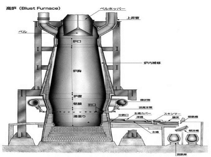 高爐是煉鐵設(shè)備,是鋼鐵冶煉的第一道工序,即鐵礦石須經(jīng)高爐冶煉后才能得到各種類用途的生鐵塊,或供煉鋼使用的鐵水。高爐外殼是鋼板,殼內(nèi)砌耐火磚內(nèi)襯,爐殼和耐火材料之間有冷卻設(shè)備。高爐本體自上而下分為爐喉、爐身、爐腰、爐腹、爐缸5個(gè)部分。