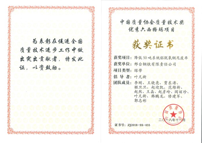邢鋼榮獲2018年中國質(zhì)量協(xié)會(huì)六西格瑪優(yōu)秀項(xiàng)目獎(jiǎng)