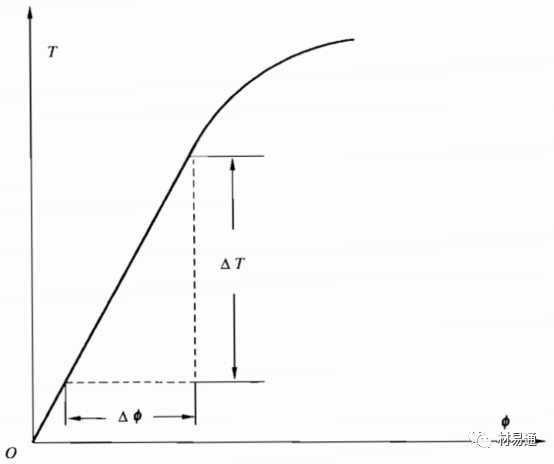 用自動(dòng)記錄方法記錄扭矩—扭角曲線。在曲線上延長彈性直線段交扭角軸于O點(diǎn),截取OC段,過C點(diǎn)作彈性直線段的平行線CA交曲線于A點(diǎn),A點(diǎn)對(duì)應(yīng)的扭矩為Tp。