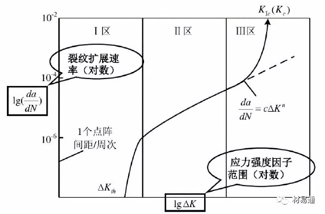 II區(qū):裂紋擴(kuò)展主要階段,10-5~10-2mm/周次,da/dN~△K呈冪函數(shù)關(guān)系,△K變化范圍很大,擴(kuò)展壽命長(zhǎng)。