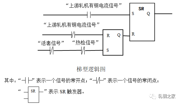 在軋件頭部進入活套后面軋機前不允許起套輥升起;在軋件頭部進入活套后面軋機后起套輥必須立即升起。當軋件尾部離開活套前面軋件時,起套輥必須立即下降。為了準確地起落套,我們首先,在活套的起落套的邏輯控制程序中設置了RS觸發(fā)器。只要下游機架“有鋼”活套就不能再次起落套。編程如下(梯型邏輯圖):其次,在起套和落套的處理上對延時時間采用了長度系數(shù)補償?shù)乃惴ǎ丛谟嬎愣〞r器的延時時間過程中將線材要走的長度(如兩機架間的距離)乘以一個百分比。這樣就可以:一、消除由于CPU軟件系統(tǒng)本身運行周期過長造成的定時計算誤差;二、靈活地適應電氣開關和機械上氣閥等的動作滯后的不一致性,以使起套輥能較準確地升起和落下。