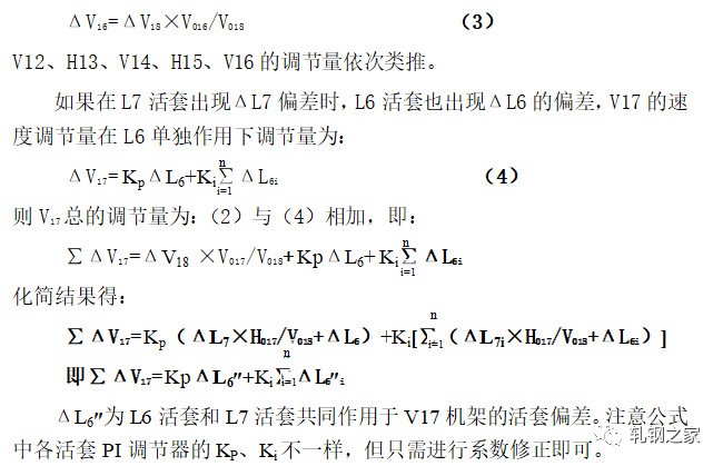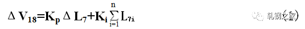 當活套一旦形成以后,活套的實際高度立即由活套掃描器測得的值經(jīng)過PI調(diào)節(jié)器,輸出一個控制信號,通過控制上游軋機,使活套大小得到調(diào)節(jié),使活套保持在設定的高度范圍。速度調(diào)節(jié)量是按逆流調(diào)速的方法,按同樣比例對軋機的工作速度進行級聯(lián)調(diào)節(jié)。假如活套L7出現(xiàn)高度差為ΔL7,則V18機架的速度調(diào)節(jié)是: