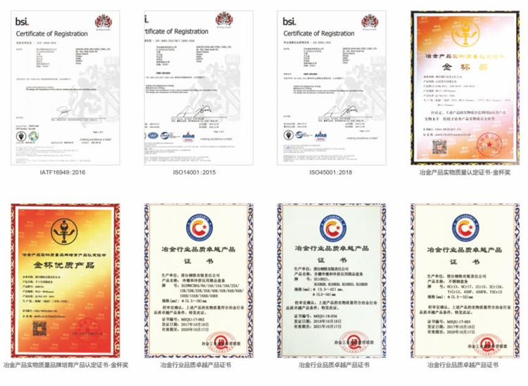 1999年邢鋼開(kāi)始推行質(zhì)量管理體系,成為最早一批通GB/T19000族標(biāo)準(zhǔn)過(guò)認(rèn)證的鋼企之一。2006年,作為全國(guó)首批鋼鐵企業(yè),邢鋼全流程通過(guò)了英標(biāo)認(rèn)證公司TS16949汽車行業(yè)質(zhì)量管理體系。產(chǎn)品研發(fā)也是芝麻開(kāi)花節(jié)節(jié)高,通過(guò)創(chuàng)新研發(fā)模式相繼開(kāi)發(fā)了汽車用鋼、鐵路用鋼,高強(qiáng)橋梁用鋼,耐候鋼、重熔鋼等產(chǎn)品,涵蓋冷鐓鋼、彈簧鋼、軸承鋼、純鐵、預(yù)應(yīng)力鋼、易切削鋼、工模具鋼、耐候鋼等十八大系列。如今的邢鋼已經(jīng)通過(guò)EMS,OHSMS等9個(gè)體系認(rèn)證!