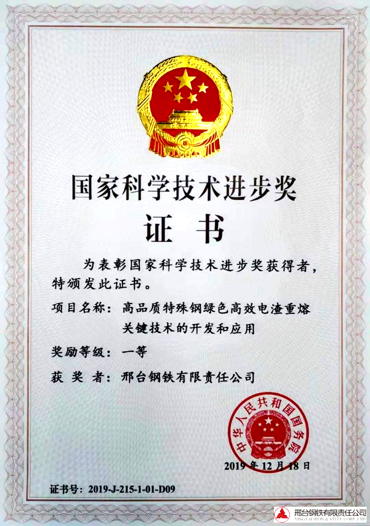 2019邢鋼“高品質(zhì)特殊鋼綠色高效電渣重熔關(guān)鍵技術(shù)的開(kāi)發(fā)和應(yīng)用”還榮獲國(guó)家科學(xué)技術(shù)進(jìn)步獎(jiǎng)一等獎(jiǎng)。
