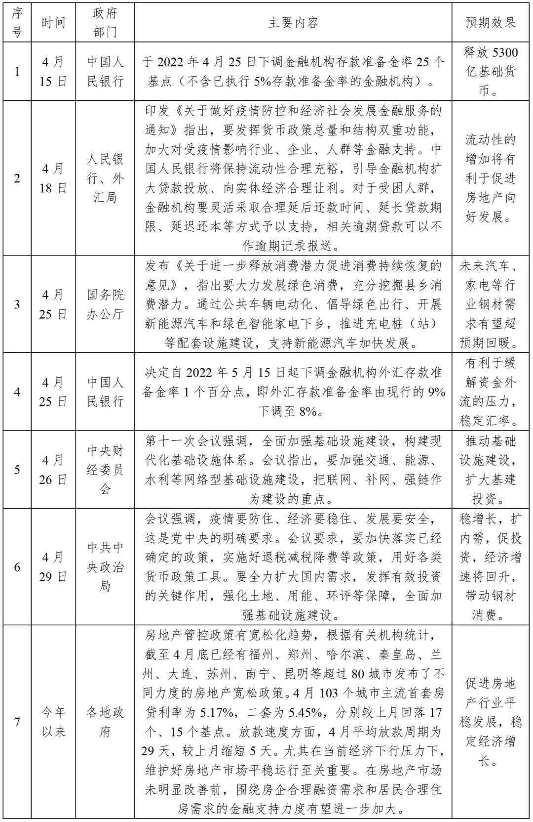雖然3、4月份我國經(jīng)濟下行壓力加大,消費、房地產(chǎn)、制造業(yè)等指標數(shù)據(jù)下滑明顯。但是,近期一系列 穩(wěn)定經(jīng)濟增長政策的持續(xù)出臺,將對未來經(jīng)濟和鋼材消費提供重要的支撐和動力。