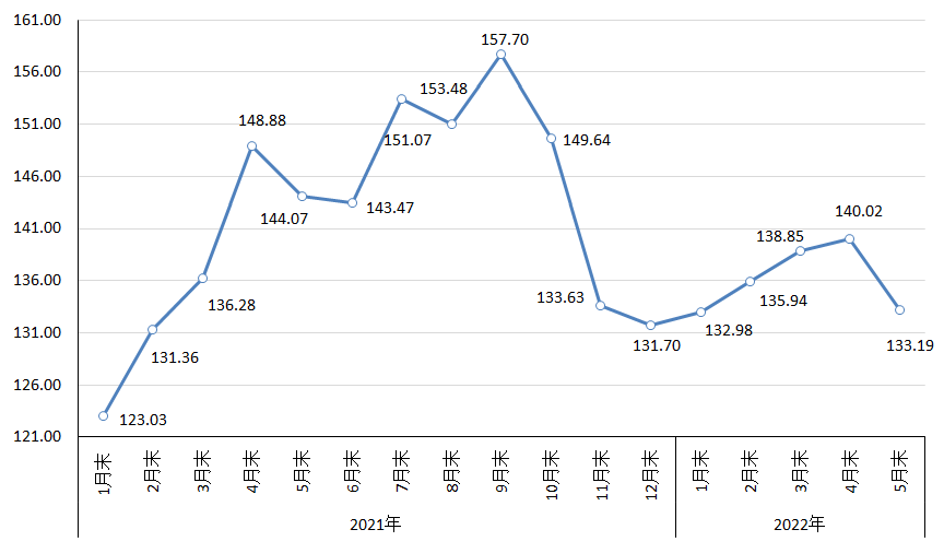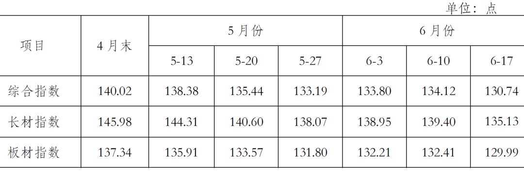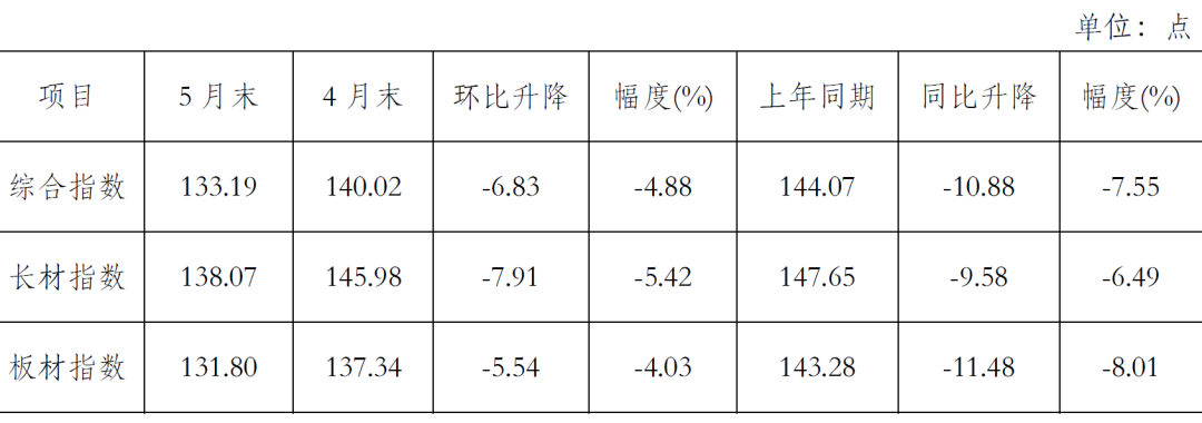 5月末,CSPI長(zhǎng)材指數(shù)為138.07點(diǎn),環(huán)比下降7.91點(diǎn),降幅為5.42%;CSPI板材指數(shù)為131.80點(diǎn),環(huán)比下降5.54點(diǎn),降幅為4.03%。與上年同期相比,長(zhǎng)材、板材指數(shù)分別下降9.58點(diǎn)和11.48點(diǎn),降幅分別為6.49%和8.01%。(見下表)