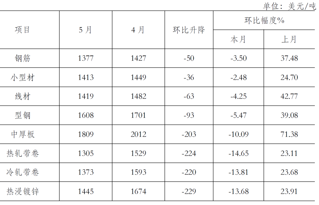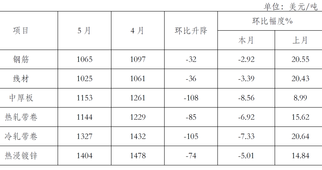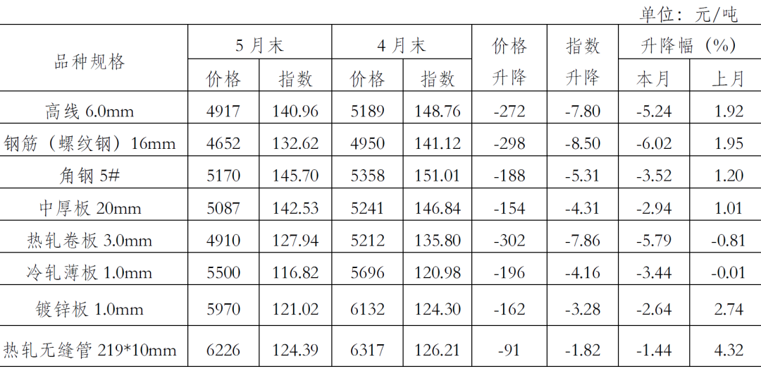 5月末,鋼鐵協(xié)會(huì)監(jiān)測(cè)的八大鋼材品種價(jià)格均有所下降。其中,熱軋卷板和冷軋薄板繼續(xù)下降,且降幅較上月有所加大,環(huán)比分別下降302元/噸和196元/噸;高線、三級(jí)鋼筋、角鋼、中厚板、鍍鋅板和熱軋無(wú)縫管價(jià)格由升轉(zhuǎn)降,環(huán)比分別下降272元/噸、298元/噸、188元/噸、154元/噸、162元/噸和91元/噸。(見下表)