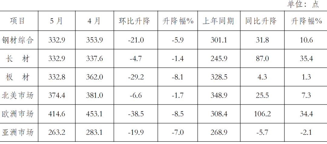 5月份,CRU國(guó)際鋼材價(jià)格指數(shù)為332.9點(diǎn),環(huán)比下降21.0點(diǎn),降幅為5.9%;同比上升31.8點(diǎn),升幅為10.6%。(見下圖)