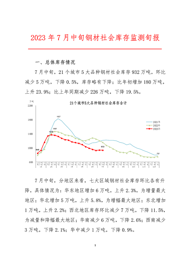 中鋼協(xié):7月中旬鋼材社會(huì)庫(kù)存932萬噸 環(huán)比下降0.5%