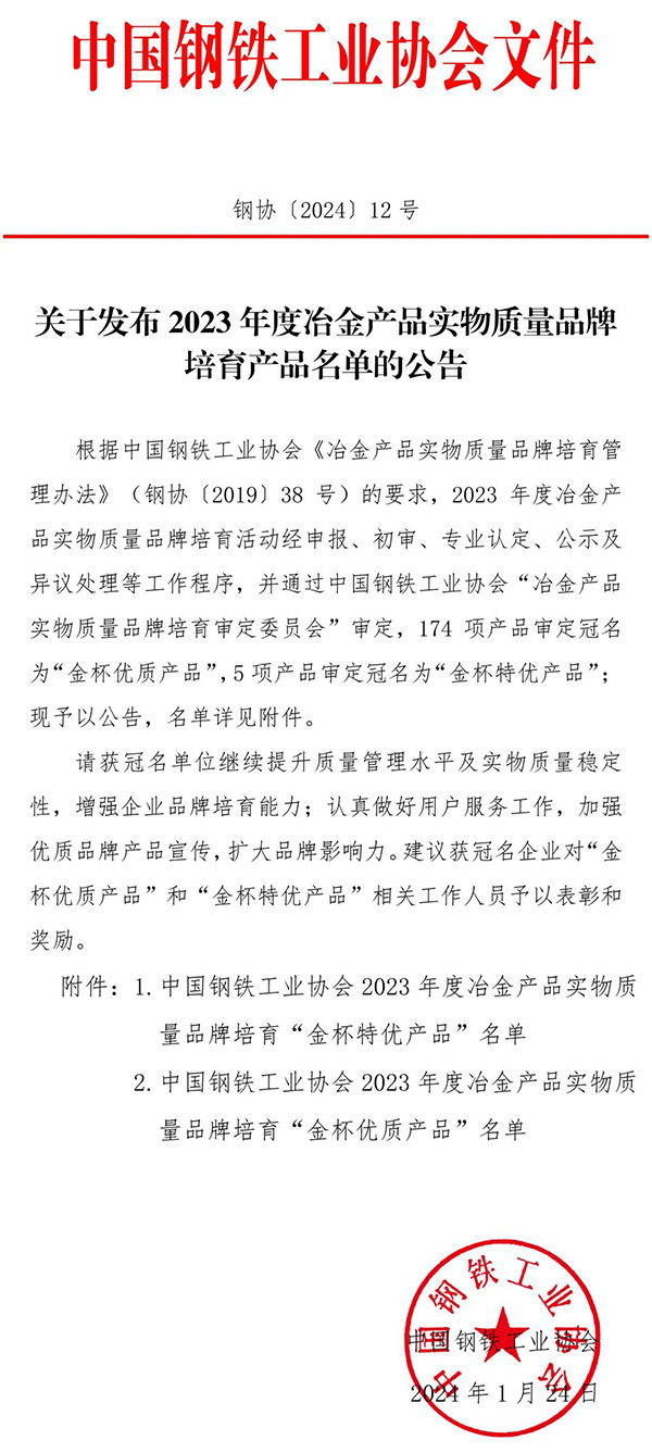 2024年1月24日,中國(guó)鋼鐵工業(yè)協(xié)會(huì)發(fā)布2023年度冶金產(chǎn)品實(shí)物質(zhì)量品牌培育產(chǎn)品名單公告,邢臺(tái)鋼鐵申報(bào)的《冷鐓和冷擠壓用熱軋盤條ML08Al》和《冷鐓和冷擠壓用熱軋盤條ML20MnTiB》獲冶金產(chǎn)品實(shí)物質(zhì)量品牌培育“金杯優(yōu)質(zhì)產(chǎn)品”。 至此,在合金冷墩鋼、簾線鋼、軸承鋼、焊接用鋼、預(yù)應(yīng)力、易切削鋼、耐候鋼種等應(yīng)用領(lǐng)域,邢鋼共有近50個(gè)產(chǎn)品獲此殊榮,這標(biāo)志著公司高端鋼種產(chǎn)品實(shí)物質(zhì)量達(dá)到了國(guó)際同類產(chǎn)品實(shí)物水平。