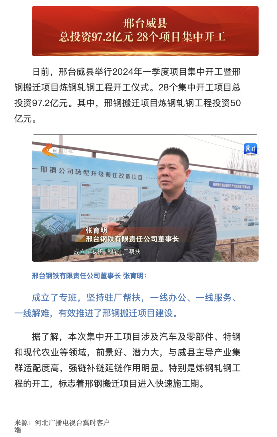 邢鋼搬遷項目既是威縣落實省市戰(zhàn)略部署,布局縣域新材料產(chǎn)業(yè)基地的重大決策,也是打造威縣300億元特鋼產(chǎn)業(yè)集群的龍頭項目、戰(zhàn)略支撐項目。