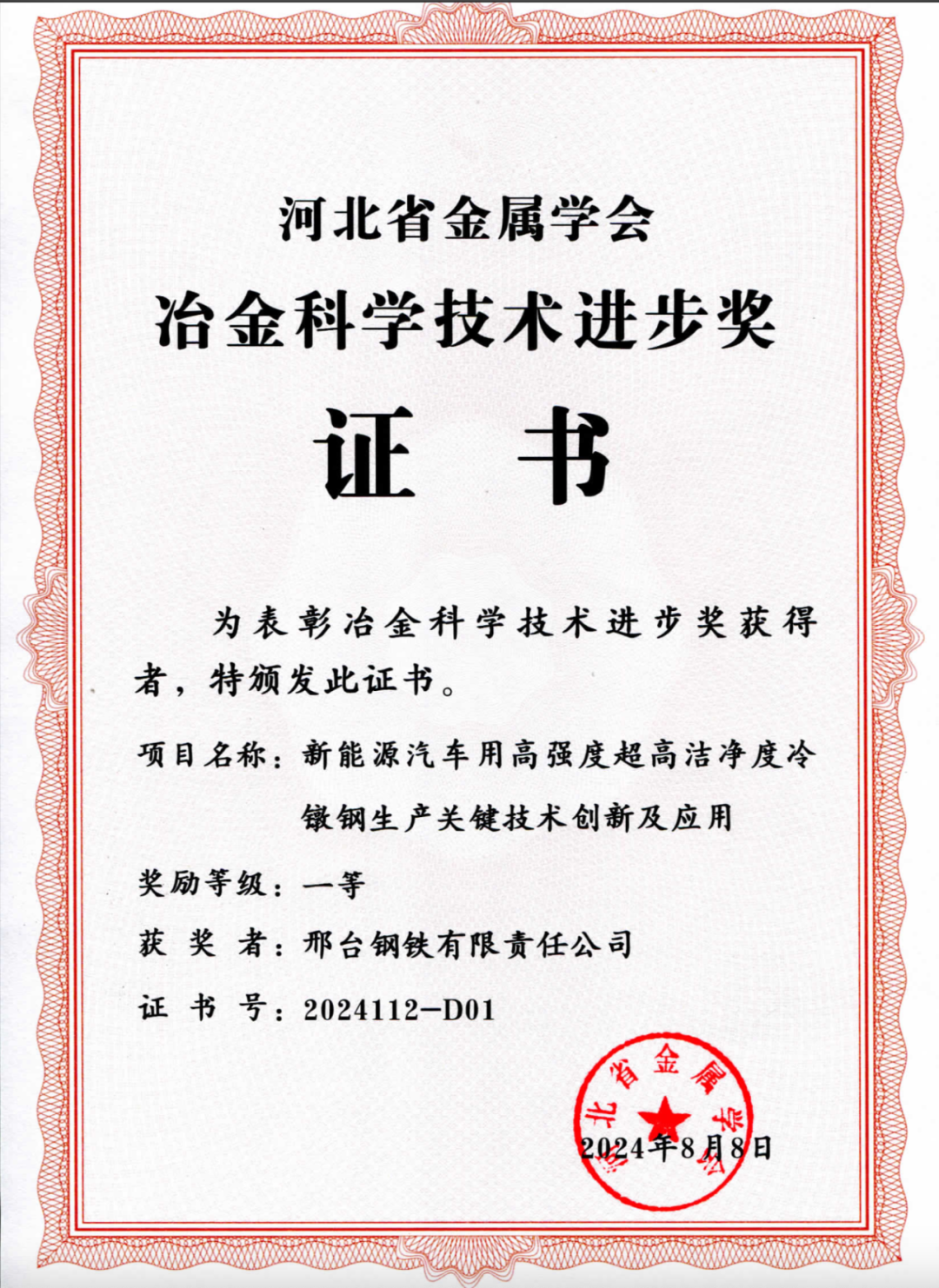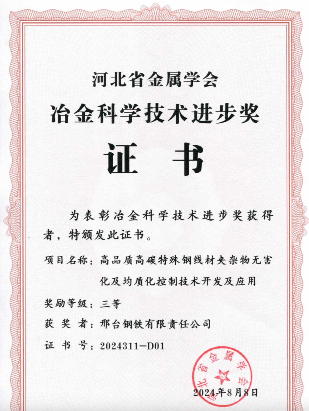 近日,邢臺(tái)鋼鐵有限責(zé)任公司兩項(xiàng)科技成果“新能源汽車用高強(qiáng)度超高潔凈度冷鐓鋼生產(chǎn)關(guān)鍵技術(shù)創(chuàng)新及應(yīng)用”“高品質(zhì)高碳特殊鋼線材夾雜物無(wú)害化及均質(zhì)化控制技術(shù)開(kāi)發(fā)及應(yīng)用”得到河北省金屬學(xué)會(huì)專家評(píng)審委員會(huì)的高度認(rèn)可,分別榮獲2024年度 “河北冶金科學(xué)技術(shù)獎(jiǎng)”一、三等獎(jiǎng)。