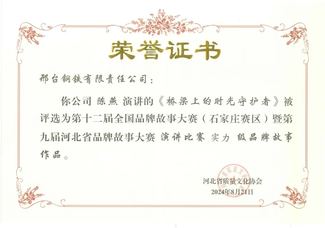 經(jīng)過激烈的角逐,邢鋼參賽的兩部演講作品《橋梁上的時光守護者》、《碧水守護,打開泉城綠色畫卷》,憑借其鮮明的主題、完整的情節(jié)、生動的語言、深刻的感染力以及自信的表現(xiàn)力脫穎而出,贏得本次大賽“實力級”榮譽。邢鋼申報的《赤子之心》、《三代邢鋼人共鑄輝煌夢》等征文、短視頻作品也榮獲“優(yōu)秀級”、“潛力級”證書。