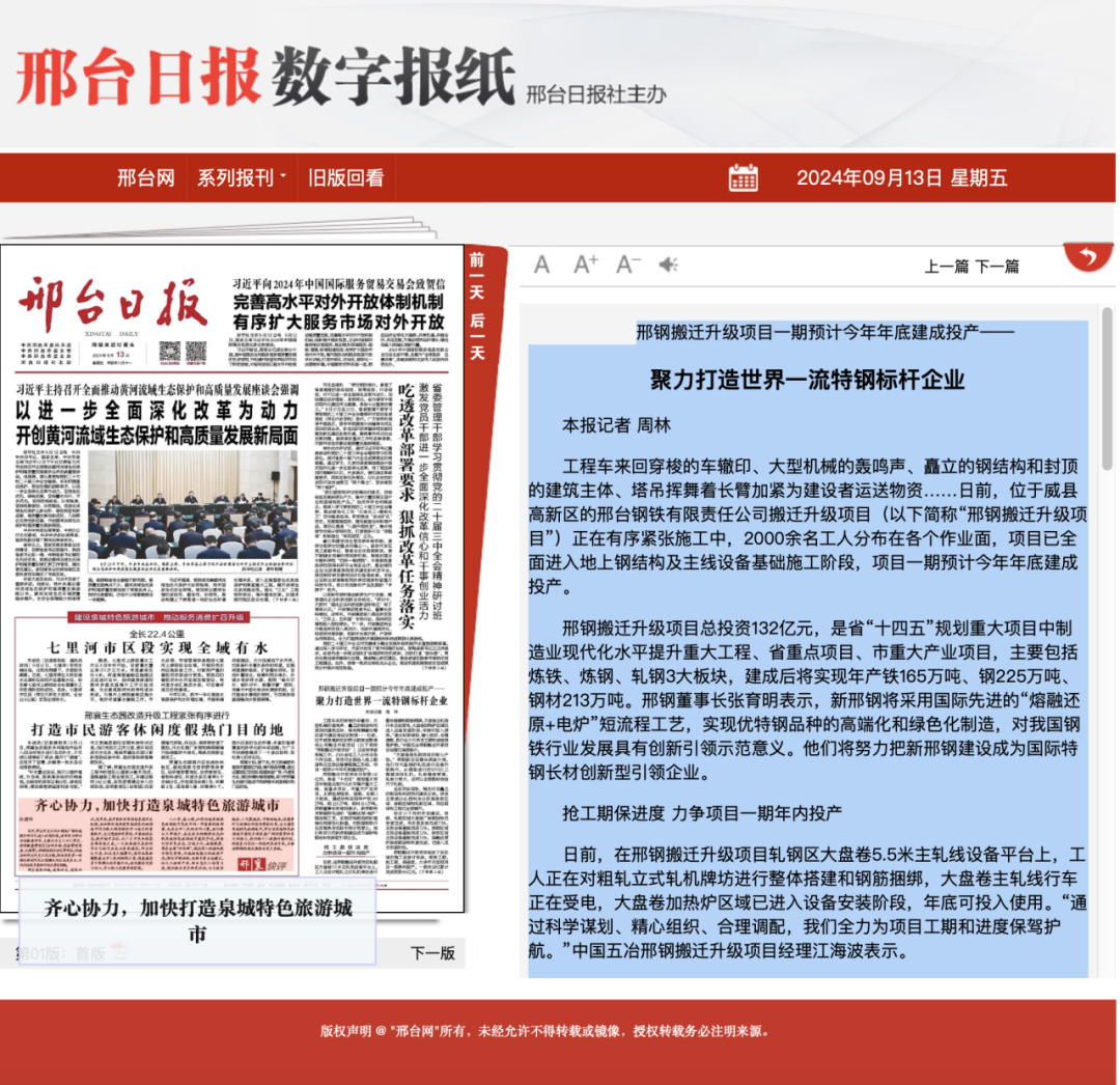 邢鋼搬遷升級項目是落實省市戰(zhàn)略部署,布局縣域新材料產(chǎn)業(yè)基地的重大決策,也是打造威縣300億元特鋼產(chǎn)業(yè)集群的龍頭項目、戰(zhàn)略支撐項目。 瞄準(zhǔn)建設(shè)世界一流特鋼標(biāo)桿企業(yè),該項目將聚焦高強度耐熱鋼、免退火冷鐓鋼、高強度耐延遲斷裂鋼等10大系列高精尖鋼種,塑造綠色、精品、智慧的特鋼品牌。