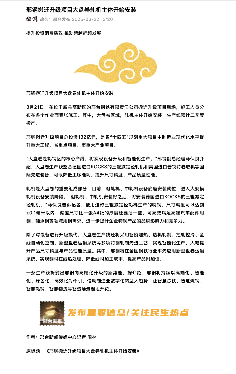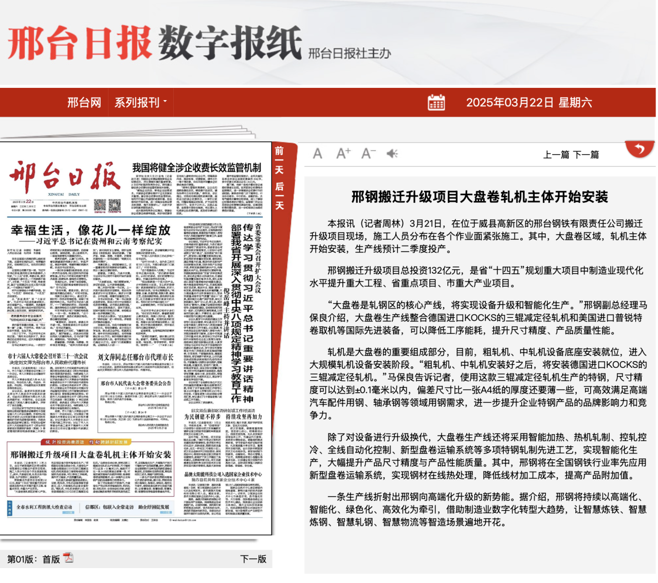 3月21日,在位于威縣高新區(qū)的邢臺鋼鐵有限責任公司搬遷升級項目現(xiàn)場,施工人員分布在各個作業(yè)面緊張施工。其中,大盤卷區(qū)域,軋機主體開始安裝,生產(chǎn)線預計二季度投產(chǎn)。