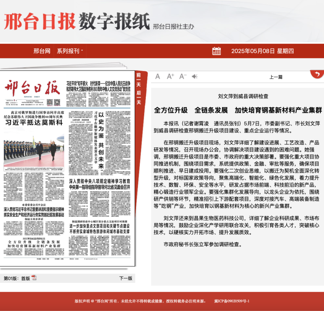 本報(bào)訊(記者謝霄凌 通訊員張釗)5月7日,市委副書(shū)記、市長(zhǎng)劉文萍到威縣調(diào)研檢查邢鋼搬遷升級(jí)項(xiàng)目建設(shè)、重點(diǎn)企業(yè)運(yùn)行等情況。