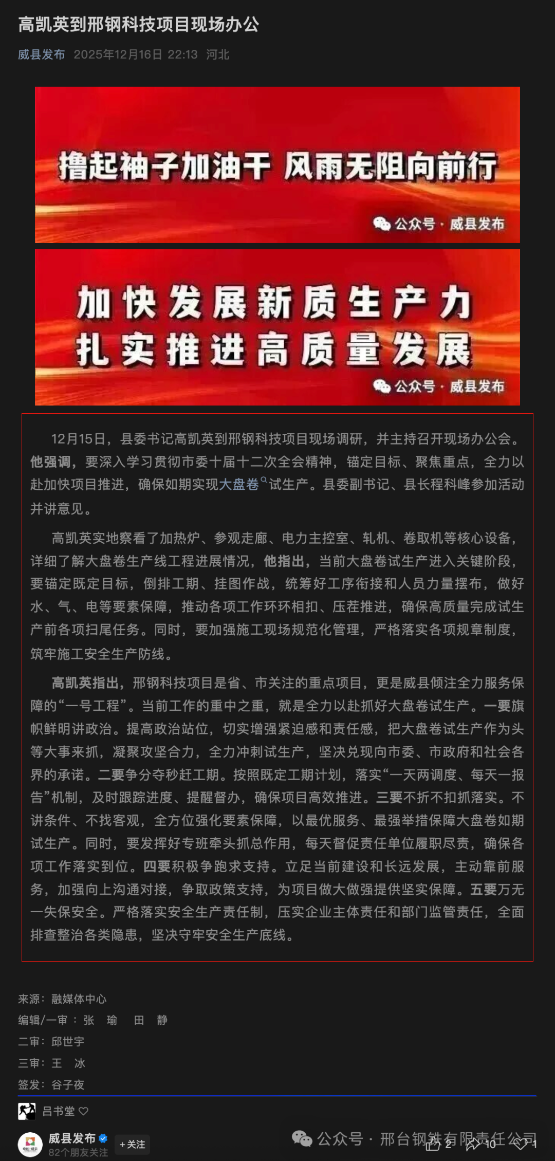 高凱英指出,邢鋼科技項目是省、市關(guān)注的重點項目,更是威縣傾注全力服務(wù)保障的“一號工程”。當(dāng)前工作的重中之重,就是全力以赴抓好大盤卷試生產(chǎn)。一要旗幟鮮明講政治。提高政治站位,切實增強(qiáng)緊迫感和責(zé)任感,把大盤卷試生產(chǎn)作為頭等大事來抓,凝聚攻堅合力,全力沖刺試生產(chǎn),堅決兌現(xiàn)向市委、市政府和社會各界的承諾。二要爭分奪秒趕工期。按照既定工期計劃,落實“一天兩調(diào)度、每天一報告”機(jī)制,及時跟蹤進(jìn)度、提醒督辦,確保項目高效推進(jìn)。三要不折不扣抓落實。不講條件、不找客觀,全方位強(qiáng)化要素保障,以最優(yōu)服務(wù)、最強(qiáng)舉措保障大盤卷如期試生產(chǎn)。同時,要發(fā)揮好專班牽頭抓總作用,每天督促責(zé)任單位履職盡責(zé),確保各項工作落實到位。四要積極爭跑求支持。立足當(dāng)前建設(shè)和長遠(yuǎn)發(fā)展,主動靠前服務(wù),加強(qiáng)向上溝通對接,爭取政策支持,為項目做大做強(qiáng)提供堅實保障。五要萬無一失保安全。嚴(yán)格落實安全生產(chǎn)責(zé)任制,壓實企業(yè)主體責(zé)任和部門監(jiān)管責(zé)任,全面排查整治各類隱患,堅決守牢安全生產(chǎn)底線。
